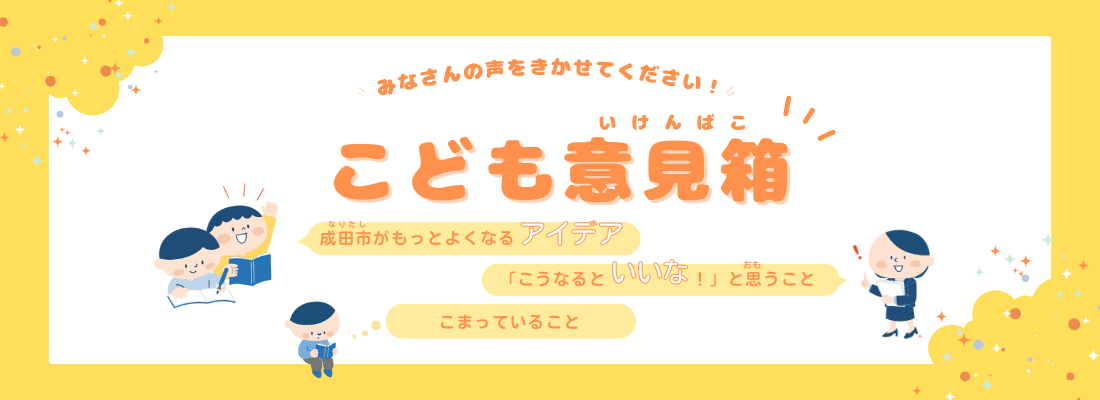 成田市では、こども・若者のみなさんの声を募集しています。 成田市をもっとよくするためのアイデアや「こうなるといいな」と思うこと、 こまっていることなど、成田市に伝えたい思いや意見をきかせてください。 ※お名前と意見は、かならず入力してください。