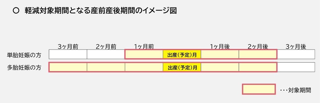 出産に伴う産前産後期間が対象期間となり、この対象期間中の所得割額と均等割額が軽減されます。対象期間は、単胎妊娠と多胎妊娠の場合で異なります。